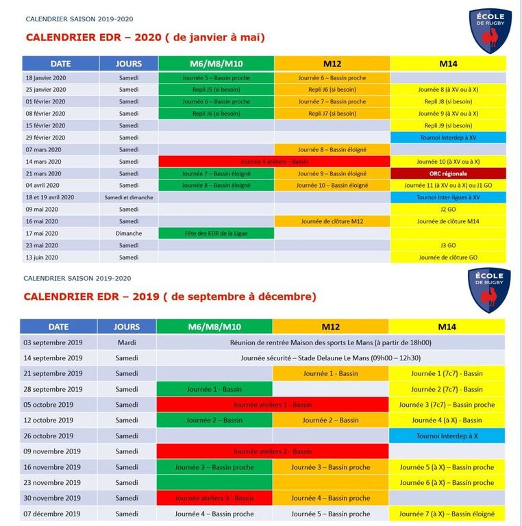 Voici le calendrier 2019 / 2020 des matchs et journées ateliers pour l'EDR.